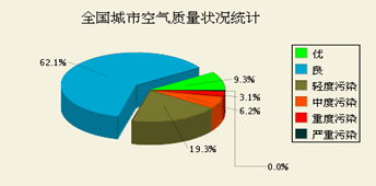 7月7日全國城市空氣質(zhì)量日報對全國城市空氣質(zhì)量狀況的檢測結(jié)果做了詳細(xì)的介紹,其中監(jiān)測指標(biāo)為空氣質(zhì)量指數(shù),即air quality index(AQI)。其中,3.1%的城市為重度污染,6.2%的城市為中度污染,19.3%的城市為輕度污染,62.1%的城市空氣質(zhì)量為良,僅有9.3%的城市空氣質(zhì)量為優(yōu)。