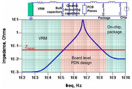 在調(diào)試該故障前先回顧下電源噪聲抑制的原理。如下圖所示,電源分配網(wǎng)絡(luò)中不同的頻段由不同的元件來抑制噪聲,去耦元件包含電源調(diào)整模塊(VRM)、去耦電容、PCB電源地平面對、器件封裝和芯片。VRM包含電源芯片及外圍的輸出電容,大約作用于DC到低頻段(100K左右),其等效模型是一個電阻和一個電感組成的二元件模型。去耦電容*好使用多個數(shù)量級容值的電容配合使用,充分覆蓋中頻段(數(shù)10K到100M左右)。由于布線電感和封裝電感的存在,即時大量堆砌去耦電容也難以在更高頻起到作用。PCB電源地平面對形成了一個平板電容,也具有去耦作用,大約作用在數(shù)十兆。芯片封裝和芯片負責(zé)高頻段(100M以上),目前的高端器件一般會在封裝上增加去耦電容,此時PCB上的去耦范圍可以降低到數(shù)十兆甚至幾兆。因此,在電流負載不變的情況下,我們只要判斷出電壓噪聲出現(xiàn)在哪個頻段,那么針對這個頻段所對應(yīng)的去耦元件進行優(yōu)化即可。在兩個去耦元件的相鄰頻段時兩個去耦元件會配合作用,所以在分析去耦元件臨界點時相鄰頻段的去耦元件也要同時納入考慮。